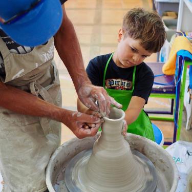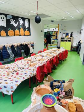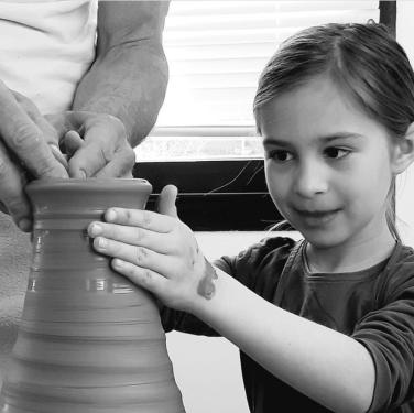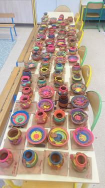 juste après avoir guider leurs mains sur le tour passage de couleur sur le tour ensuite chaque élève personnalisera sa création avec des petits collage en argile et repartira avec .